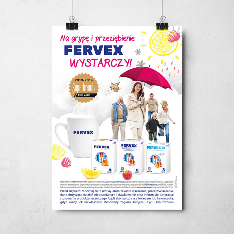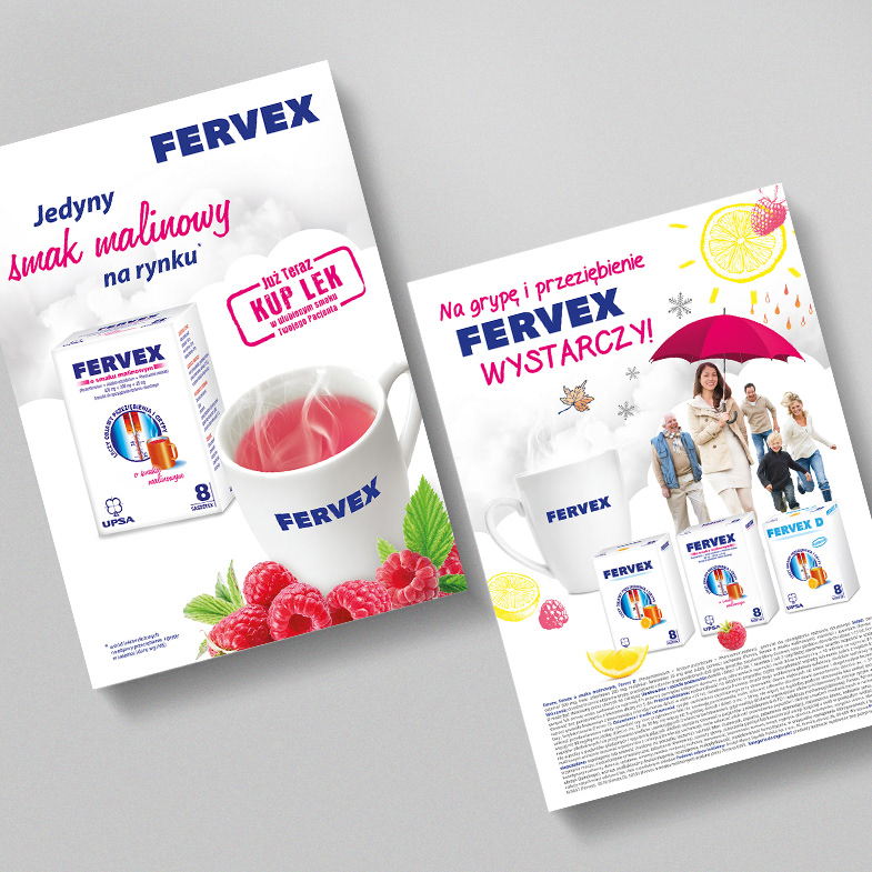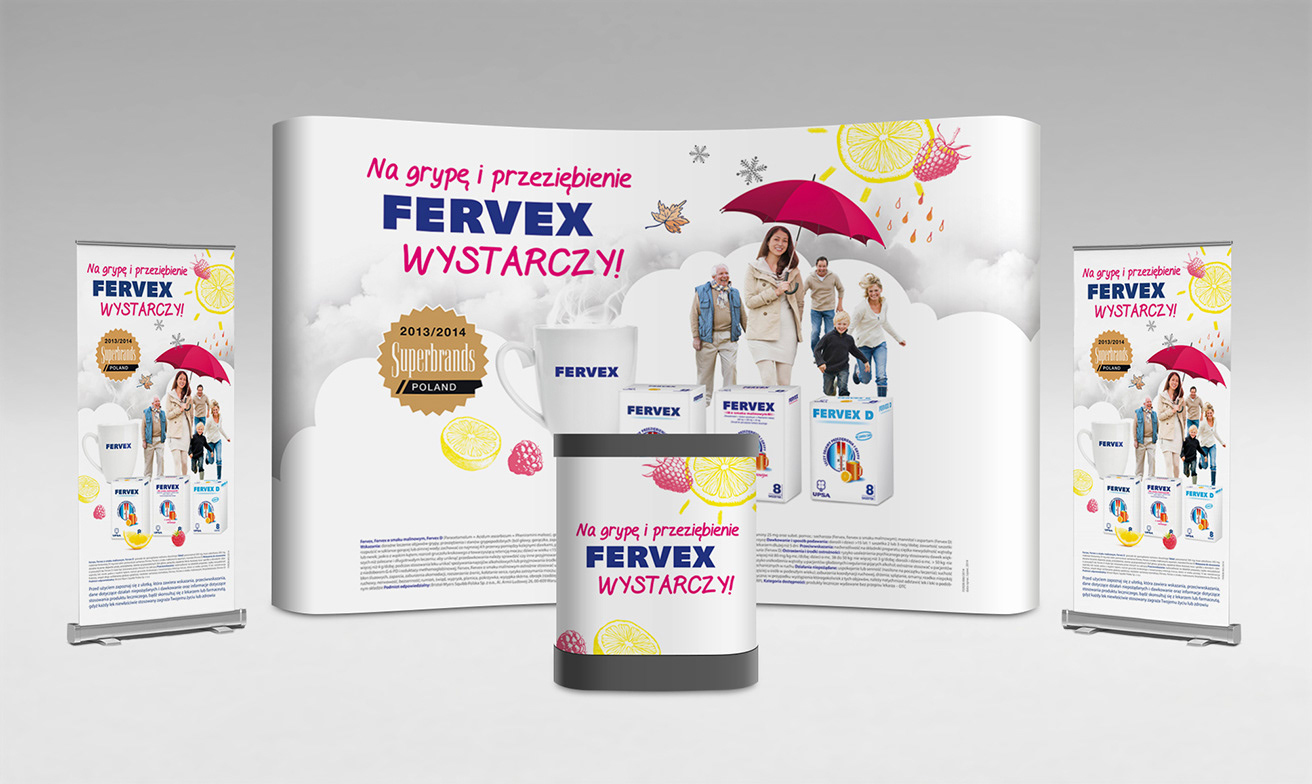 Pracując dla agencji reklamowej miałyśmy okazję współtworzyć nowy key visual dla marki Fervex oraz przygotowywać na jego bazie materiały promocyjne: plakat, ulotkę, stand, roll-up, ściankę konferencyjną, listwę, kubek i ogłoszenie prasowe.