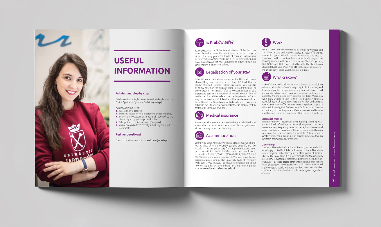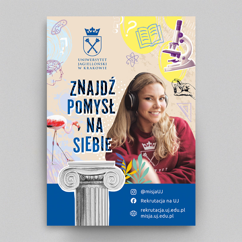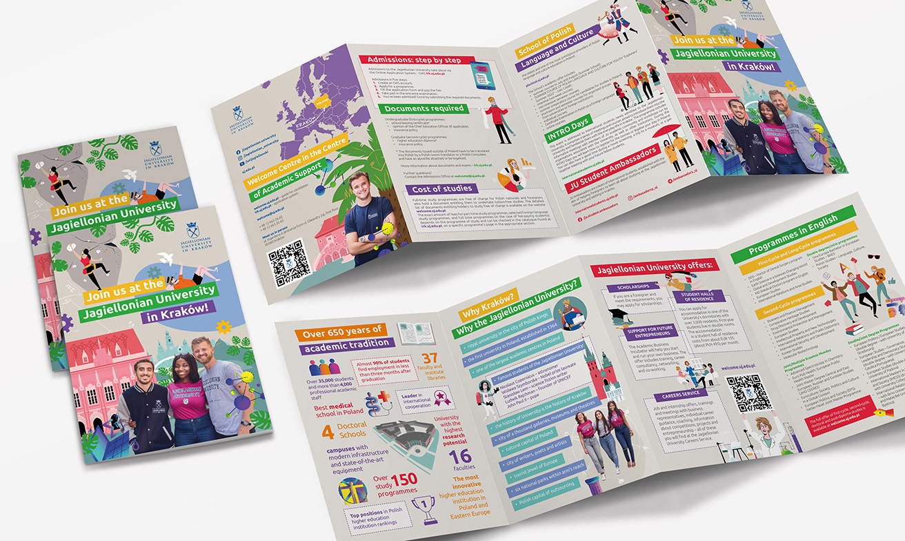 Przygotowanie materiałów promocyjnych dla Centrum Promocji i Komunikacji UJ. Projekt i opracowanie graficzne katalogów, ulotek, folderów informacyjnych oraz plakatów i banerów internetowych na kampanię rekrutacyjną.