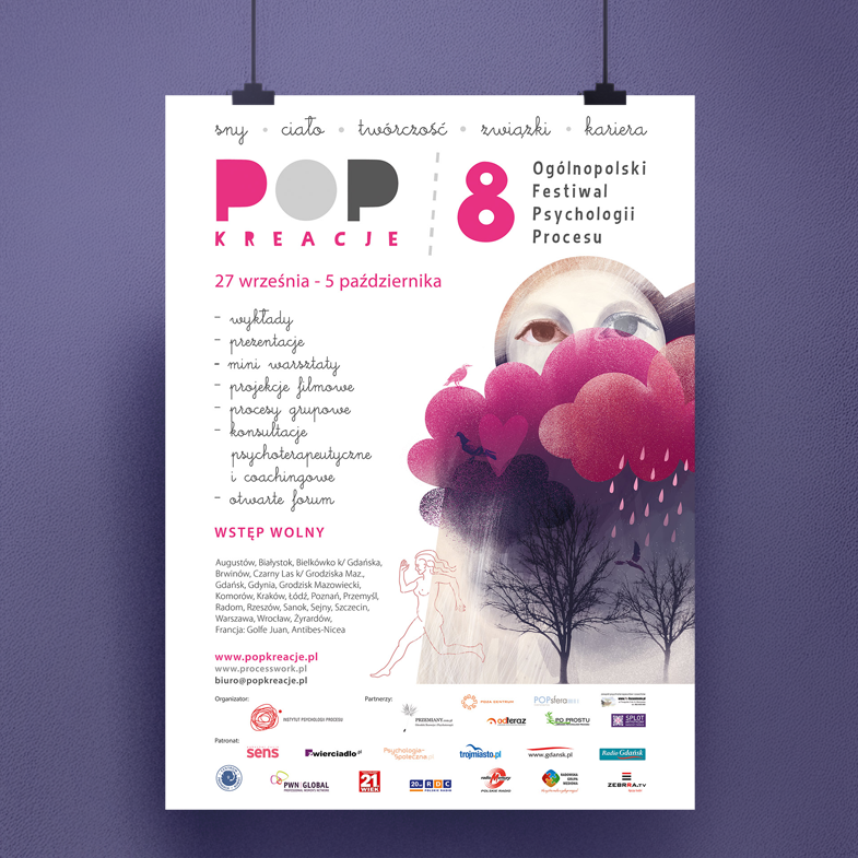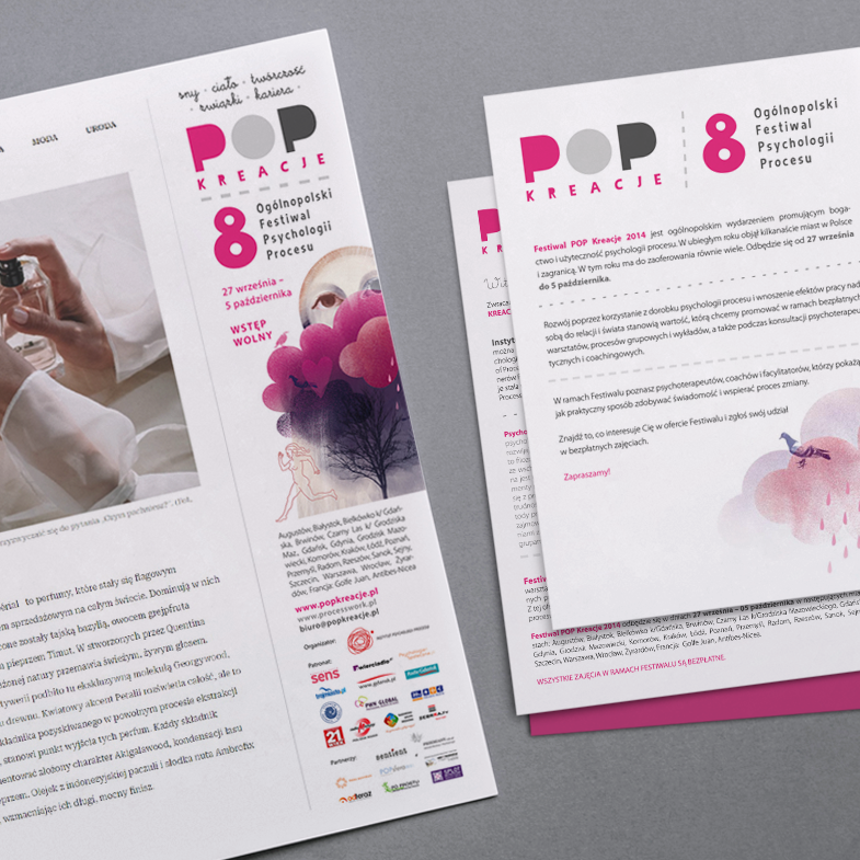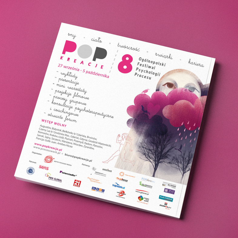 Opracowanie key visualu na potrzeby 8. edycji Ogólnopolskiego Festiwalu POP KREACJE. Projekt plakatu, ogłoszeń prasowych oraz banerów internetowych. Wykonanie ilustracji na potrzeby identyfikacji wizualnej.
