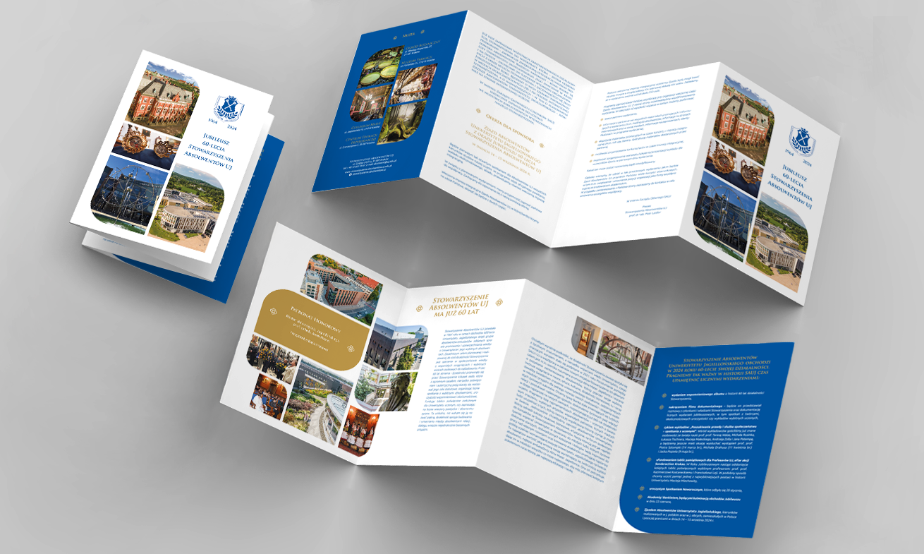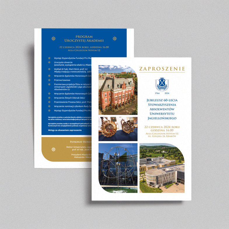 Przygotowanie materiałów promocyjnych z okazji jubileuszu 60-lecia działalności Stowarzyszenia Absolwentów Uniwersytetu Jagiellońskiego. Projekt obejmował przygotowanie plakatu, zaproszenia oraz folderu informacyjnego.